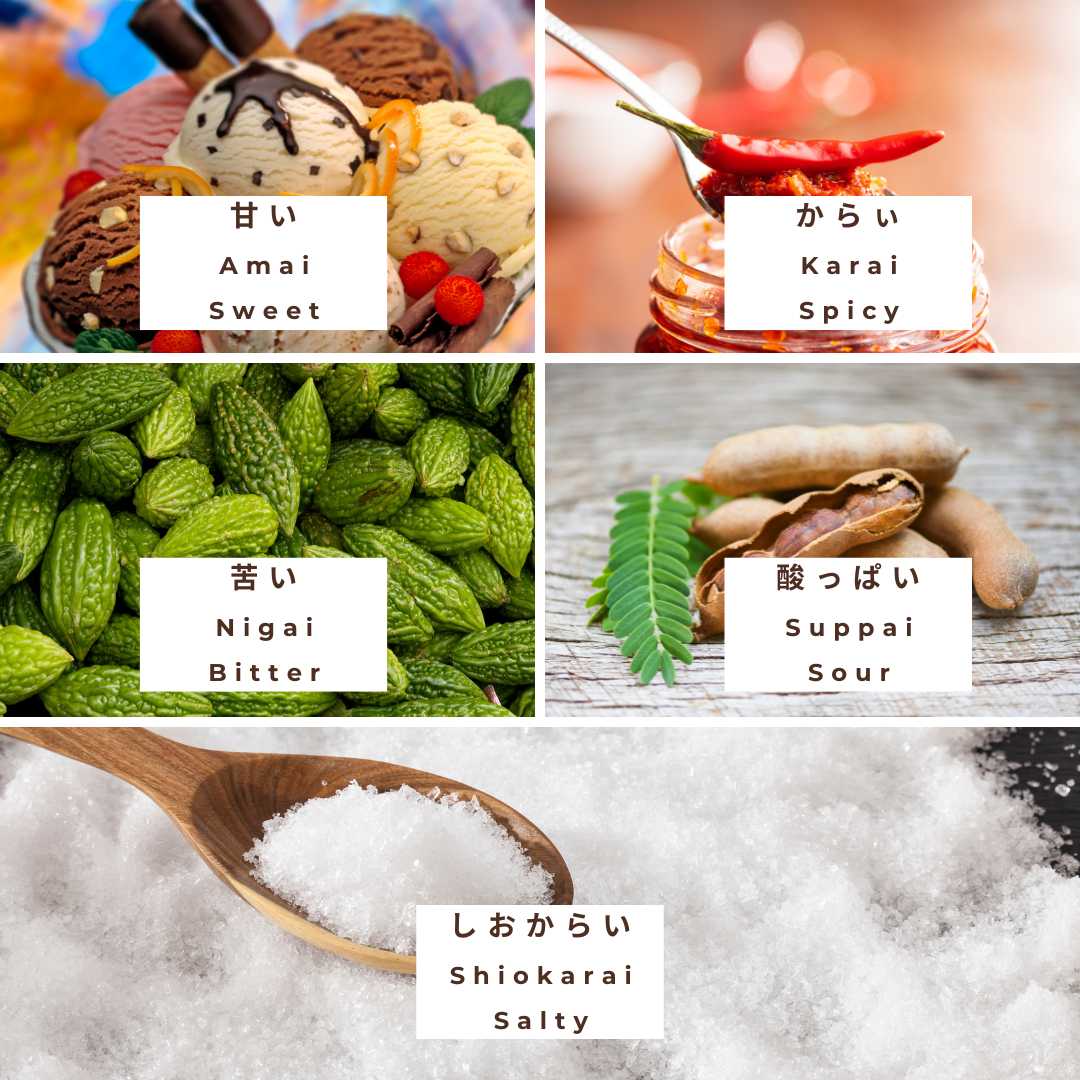 酸っぱい (Suppai): Used for sourness, it characterizes tangy sensations found in fruits like lemon and green apple, as well as in candies and tamarind.